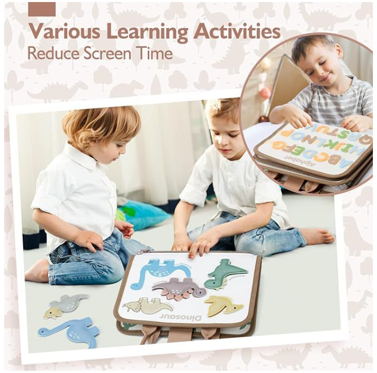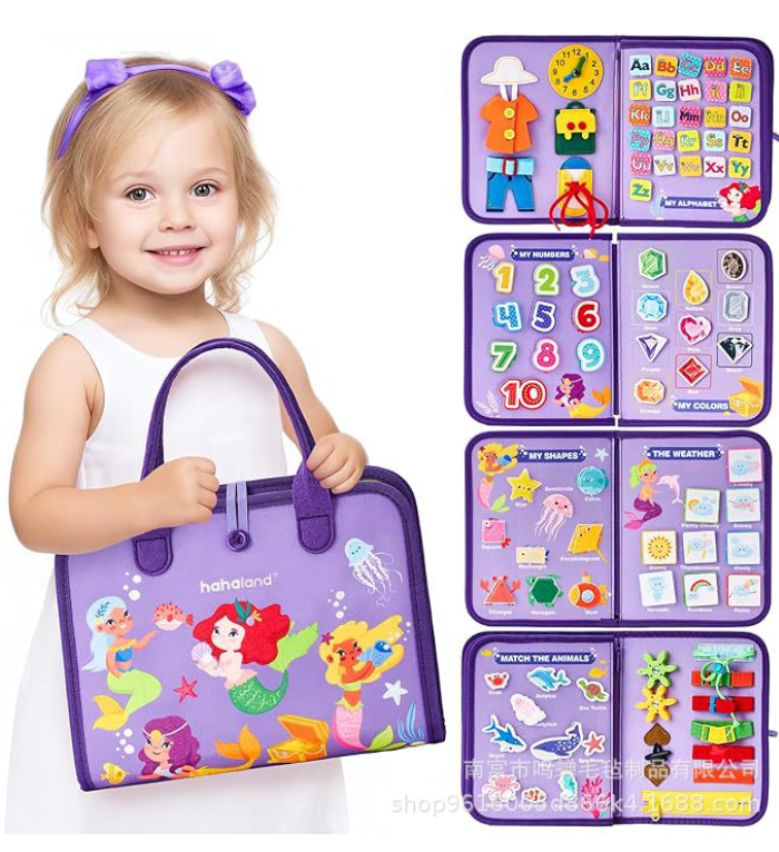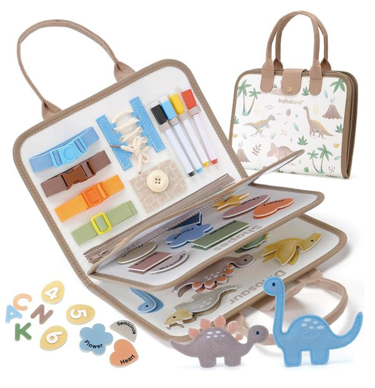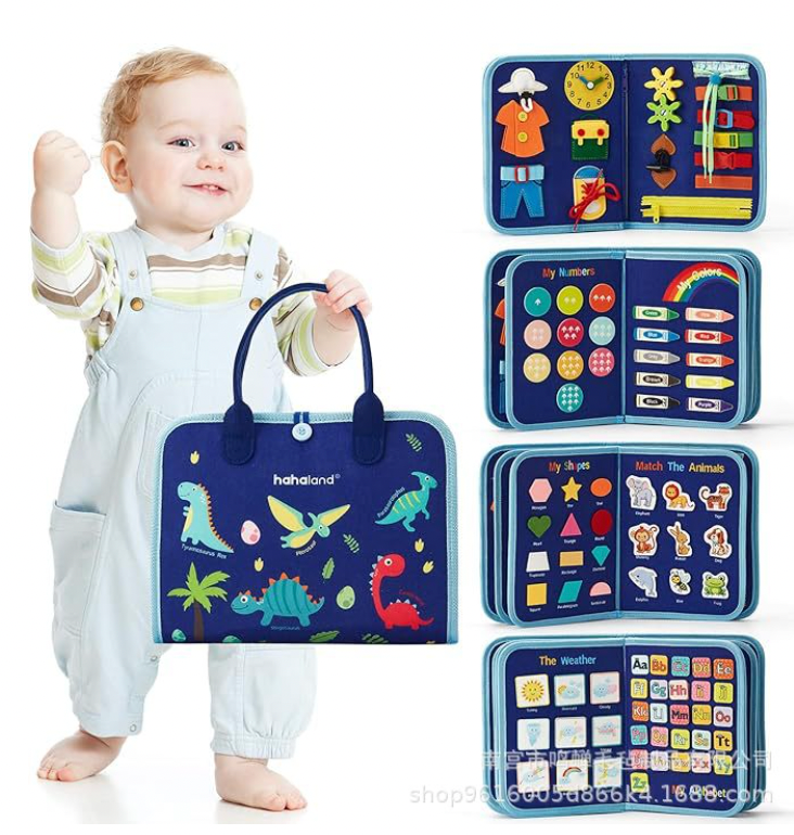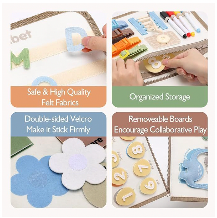 These felt activity books are great for travel. They include 4 activity pages, designed to develop self-learn dressing skills, fine motor skills, and hand-eye coordination.